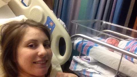 I decided, since nobody was coming, to get on the bed on my hands and knees so he would at least not fall on his head on the floor! At 8AM (after two pushes) I calmly told my husband, “heads out.” He had been watching me from the sofa and was unaware that I was even pushing. He jumps up and says, “WHAT?!” He comes over just in time for me to give a final push and he got to be the first person to hold his son! I pressed the call button and told the nurse, “We just delivered a baby in room 5!” Six people came rushing in baffled, it was awesome. I turned around and said to the nurse, “I told you he was coming!”