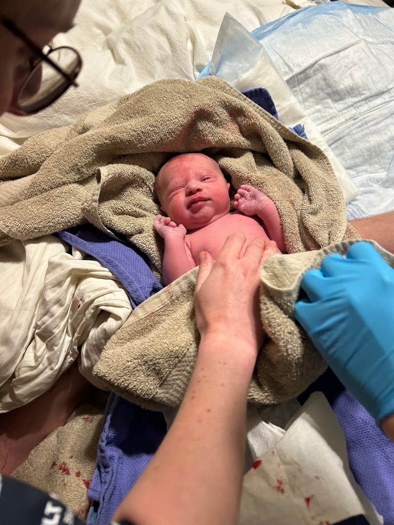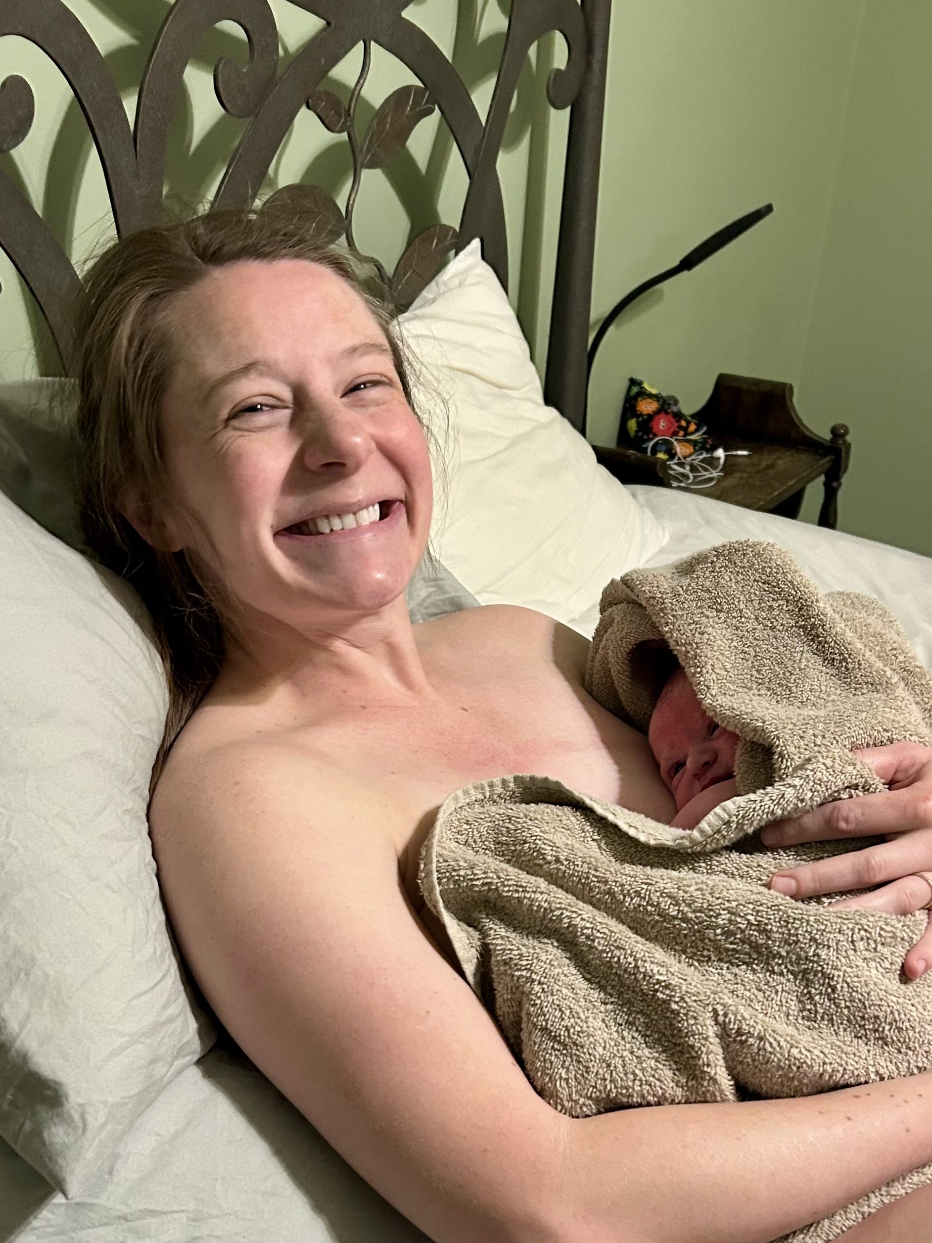 At 0515, I vomited and was writhing around, uncomfortable in any position! Our doula, Hannah Sears, said it was time to head to the hospital. I sat on the toilet for a while & started to feel bulging in between my legs. I got loud. I got up off the toilet just before 0600, trying to gather hospital bag supplies, but in the bedroom I could feel her head in my vagina! I stood beside the bed & involuntarily pushed.