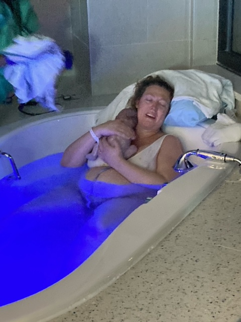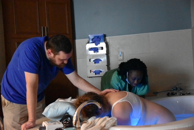 We left home at 5:20 and arrived around 5:35 to the hospital. I was roaring as I tried to walk to the front entrance and a staff person asked if I wanted i wheelchair to which I responded “it sure would be faster than me walking” – they rushed us inside and up to OB triage where I was an immediate admission. They got me in my room and began to fill up the birth tub. They did monitoring and all was okay so Brittany checked me at 6:15ish and asked if I wanted to know how dilated I was. I told her “only if it’s good” and she said mama you are at a 9cm +2! Let’s get in that tub. – side note: when we went for the scan at 2 pm I was between 4/5 -1.