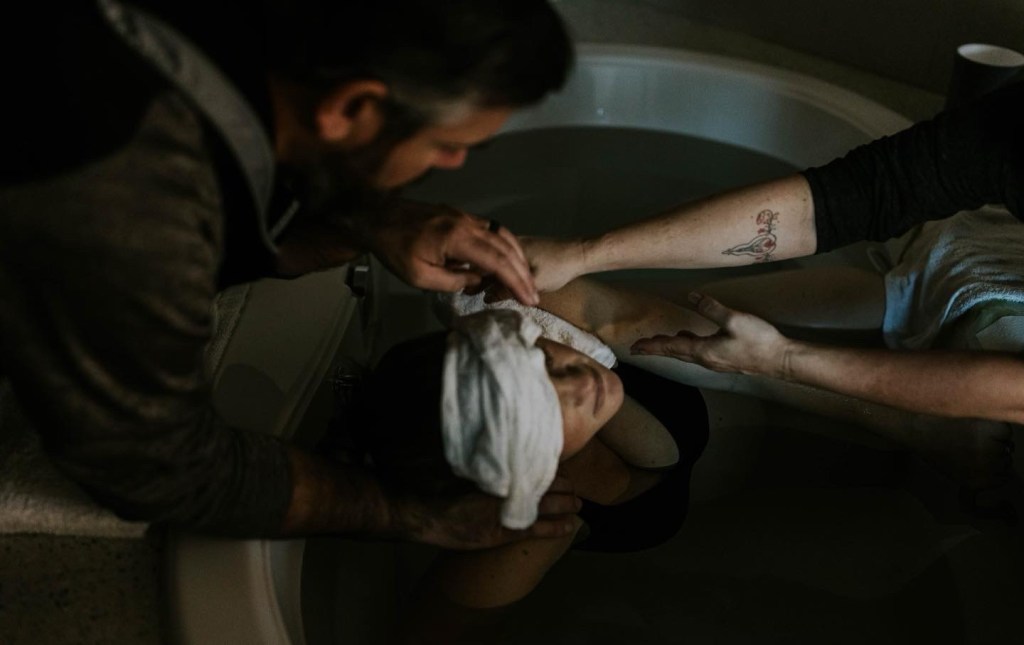 0900 – The amazing midwife and awesome nurse were in the room waiting for me, tub filled. I asked for an exam and was 9 cm!! I got right into the tub and I broke my own water in hopes that things would progress quickly. I labored there for what felt like hours but was apparently only 20-25 mins. I tried to bear down and the pain was so intense I knew I wasn’t ready yet. I asked for help getting to the bathroom so I could labor there