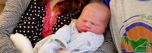 2:15pm: The midwife suggested I turn over, and Lee got behind me against the headboard. I sat in Lee’s lap and had a several more back to back contractions. I kept holding pressure between contractions so he wouldn’t retreat any.