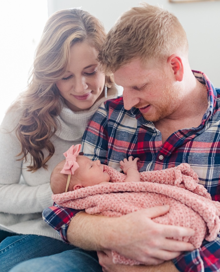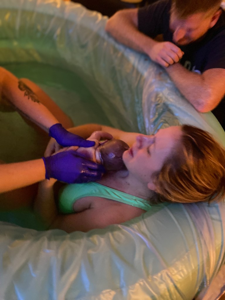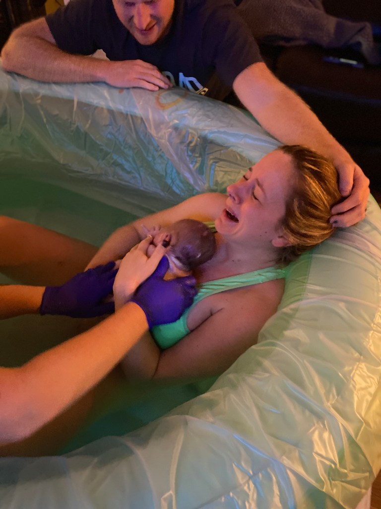 I continued in our bathtub for about an hour until my water broke. Seeing it burst in the water was the coolest thing to me. Soon after, I started feeling the need to push and they moved me to the birthing tub in our living room in front of our fireplace. We had worship music blaring, Andrew had turned on the twinkling lights, my birth affirmations were hanging up on the fireplace, the diffuser was going, and the candles were lit. It was such a beautiful and peaceful scene that I will never forget. I realized right before Rosie was born that “Great is Thy Faithfulness” had just played, but that was the song I wanted her to be born to, so I quickly asked Andrew to turn it back on. A few moments later at 3:44 a.m., my sweet 7 lb., 8 oz. bundle of joy entered this world and was placed in my arms. Time and time again throughout my life, the Lord has shown me that He is faithful, but in this beautiful moment – with my supportive husband by my side and my newborn baby in my arms – I knew it more than ever. Great was – and is – His faithfulness.